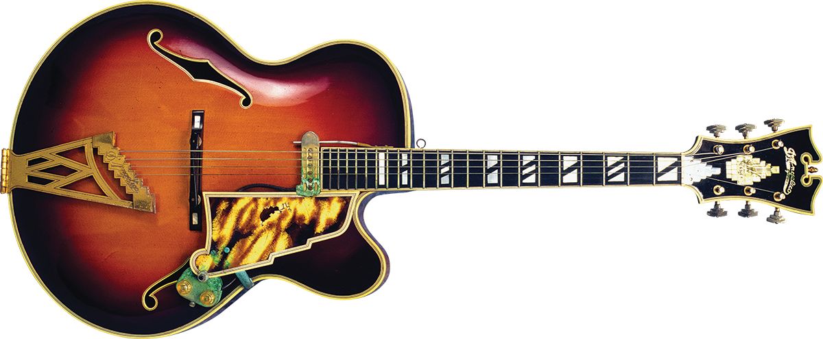 传奇的Stromberg Guitar Company , 1955年因创始人Charles Stromberg的去世而终结,生产的吉他总产量不超过640支。1949年生产的这款爵士吉他,因为Count Basie Orchestra这支轰动全美的爵士乐团闻名于世。由于他的力量感和设计,一度被认为是独一无二的爵士乐团吉他。在收藏家眼里,原木色缺角的这款最为珍贵。