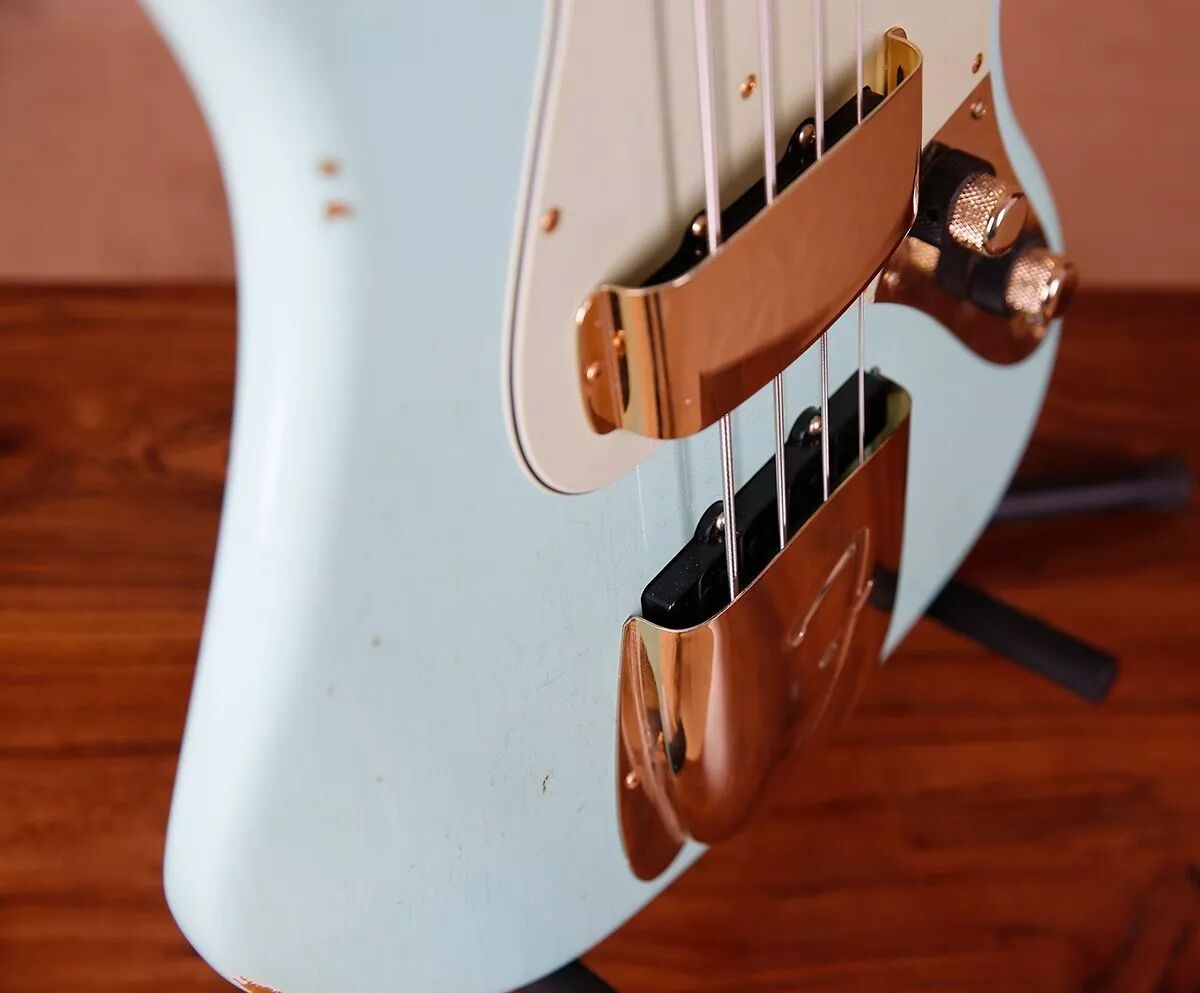 这两把Bass属于同一系列,他们都是Fender Custom Shop复刻60s J-Bass的精品。采用了枫木琴颈与玫瑰木指板。一把蓝色一把绿色包括琴头的工艺,都采用Relic做旧工艺。金属旋钮与大F护板相得益彰,配合做旧的琴身使得整把bass都是复古的气息。