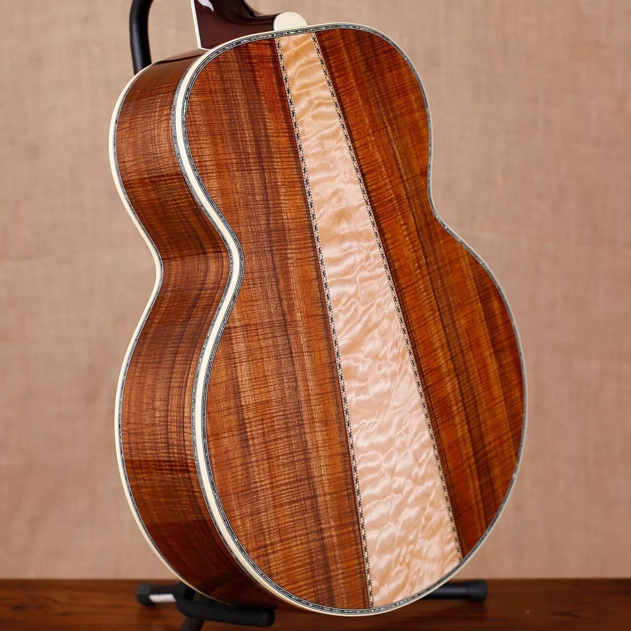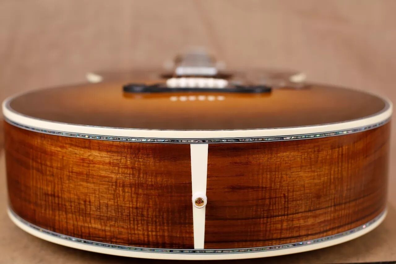 顶级的Hawaii Koa的木纹就如这把Gibson中所示,自然生长出的横纹与竖纹交错叠加,纹路分明,错落有致。拥有这样的木纹的木材是十分珍贵而且罕见的。用在这把顶级的Gibson身上也足以体现他的价值。