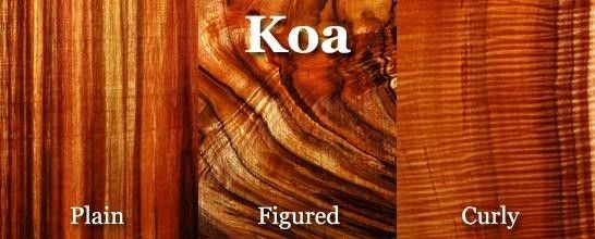 最好的HawaiiKoa木纹是由于不规则生长产生的。有些木纹在切面上呈现出向外一圈一圈发散的形状。造成这种木纹的原因主要是细胞的增长和扩散造成的。不规则的生长会造成木纹会有一种光学效应,让整把琴的木纹看起来时亮时暗有一种绸缎的感觉,这个就是由于木材的纤维结构产生的纹路。这种纹路会产生一种类似于珠宝的光泽感。由于这个木纹是被包括在木材内部的,所以在光的照射下会显得更加的夺目。