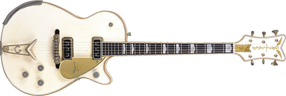 收藏家眼中的“神器”   这款Gretsch White Penguin 是吉他史上视觉效果最与众不同的流水线吉他之一。他的构思来自Gretsch公司的销售主管Jimmie Webster。他原本是参加1954年NAMM展会的一款一次性陈列用品,却在当年引起轰动,得以量产。但其实这把吉他的产量并不高。这款吉他在1955年的售价为600美元,仅次于Gibson的最顶级 Super 400系列吉他。