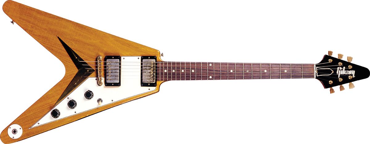 初代版的Flying V产量非常小,仅有98支,采用艳丽榄仁木琴体和两个双线圈拾音器,有黑色和浅棕色两个版本。